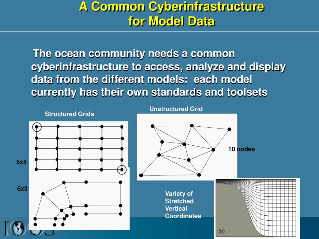 A Common Cyberinfrastructure for Model Data The ocean community needs a common cyberinfrastructure to access, analyze and display data from the different models: each model currently has their own standards and toolsets Unstructured Grid Structured Grids 10 nodes 5x5 6x3 Variety of Stretched Vertical Coordinates