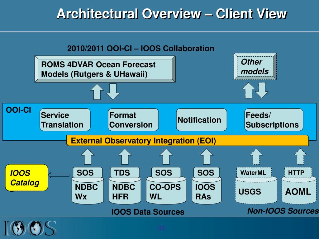 Architectural Overview – Client View 2010/2011 OOI-CI – IOOS Collaboration Other models ROMS 4DVAR Ocean Forecast Models (Rutgers & UHawaii) OOI-CI OOI-CI Service Translation Format Conversion Notification Feeds/ Subscriptions Service Translation Format Conversion Notification Feeds/ Subscriptions External Observatory Integration (EOI) External Observatory Integration (EOI) External Observatory Integration (EOI) IOOS Catalog IOOS Catalog SOS TDS SOS SOS WaterML HTTP USGS AOML NDBC Wx NDBC HFR CO-OPS WL IOOS RAs Non-IOOS Sources IOOS Data Sources 33