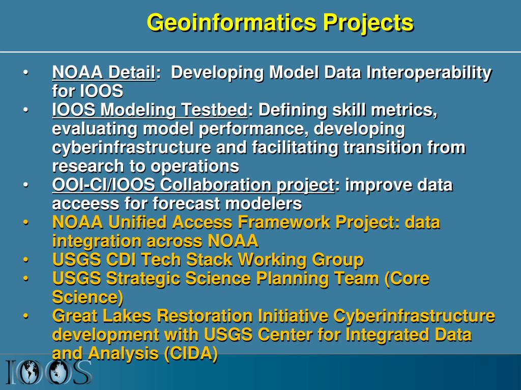 Geoinformatics Projects • NOAA Detail: Developing Model Data Interoperability for IOOS • IOOS Modeling Testbed: Defining skill metrics, evaluating model performance, developing cyberinfrastructure and facilitating transition from research to operations • OOI-CI/IOOS Collaboration project: improve data acceess for forecast modelers • NOAA Unified Access Framework Project: data integration across NOAA • USGS CDI Tech Stack Working Group • USGS Strategic Science Planning Team (Core Science) • Great Lakes Restoration Initiative Cyberinfrastructure development with USGS Center for Integrated Data and Analysis (CIDA)