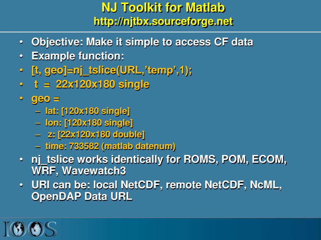 NJ Toolkit for Matlabhttp://njtbx.sourceforge.net • Objective: Make it simple to access CF data • Example function: • [t, geo]=nj_tslice(URL,’temp’,1); • t = 22x120x180 single • geo = • lat: [120x180 single] • lon: [120x180 single] • z: [22x120x180 double] • time: 733582 (matlabdatenum) • nj_tslice works identically for ROMS, POM, ECOM, WRF, Wavewatch3 • URI can be: local NetCDF, remote NetCDF, NcML, OpenDAP Data URL