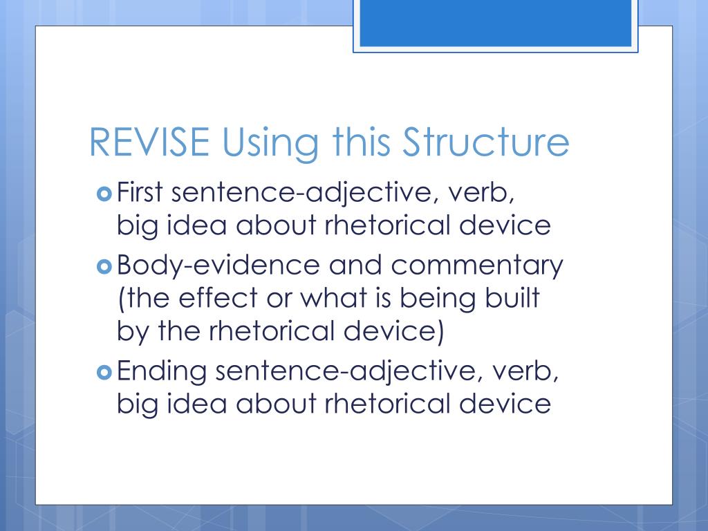 REVISE Using this Structure • First sentence-adjective, verb, big idea about rhetorical device • Body-evidence and commentary (the effect or what is being built by the rhetorical device) • Ending sentence-adjective, verb, big idea about rhetorical device