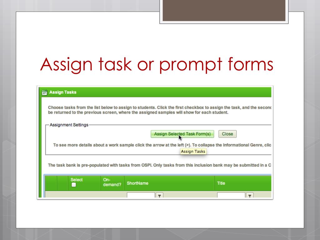 Step 3: Assign Tasks/Prompts • Teachers and students are encouraged to work together to choose tasks • All tasks must come from the inclusion bank • At least two tasks/prompts must be on-demand