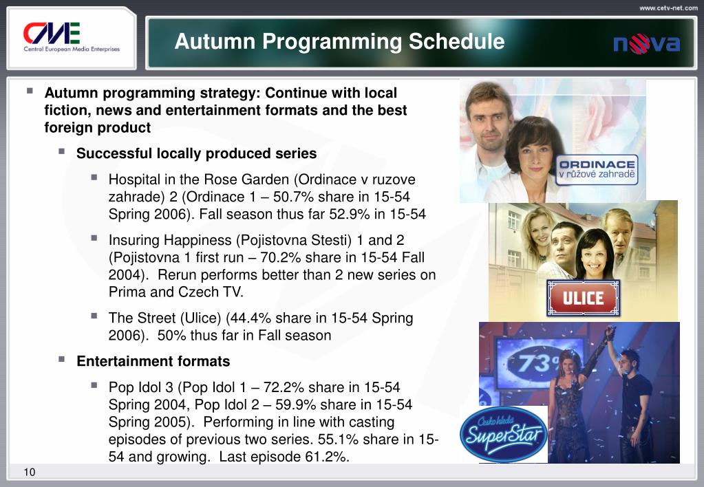 Autumn Programming Schedule • Autumn programming strategy: Continue with local fiction, news and entertainment formats and the best foreign product • Successful locally produced series • Hospital in the Rose Garden (Ordinace v ruzove zahrade) 2 (Ordinace 1 – 50.7% share in 15-54 Spring 2006). Fall season thus far 52.9% in 15-54 • Insuring Happiness (Pojistovna Stesti) 1 and 2 (Pojistovna 1 first run – 70.2% share in 15-54 Fall 2004). Rerun performs better than 2 new series on Prima and Czech TV. • The Street (Ulice) (44.4% share in 15-54 Spring 2006). 50% thus far in Fall season • Entertainment formats • Pop Idol 3 (Pop Idol 1 – 72.2% share in 15-54 Spring 2004, Pop Idol 2 – 59.9% share in 15-54 Spring 2005). Performing in line with casting episodes of previous two series. 55.1% share in 15-54 and growing. Last episode 61.2%.