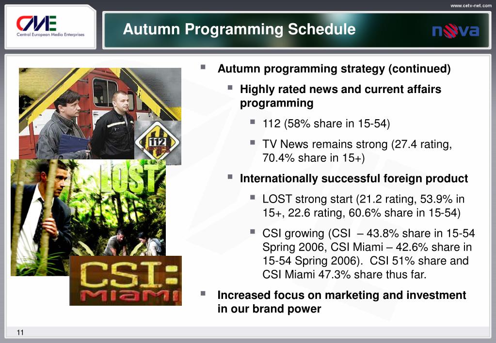 Autumn Programming Schedule • Autumn programming strategy (continued) • Highly rated news and current affairs programming • 112 (58% share in 15-54) • TV News remains strong (27.4 rating, 70.4% share in 15+) • Internationally successful foreign product • LOST strong start (21.2 rating, 53.9% in 15+, 22.6 rating, 60.6% share in 15-54) • CSI growing (CSI – 43.8% share in 15-54 Spring 2006, CSI Miami – 42.6% share in 15-54 Spring 2006). CSI 51% share and CSI Miami 47.3% share thus far. • Increased focus on marketing and investment in our brand power