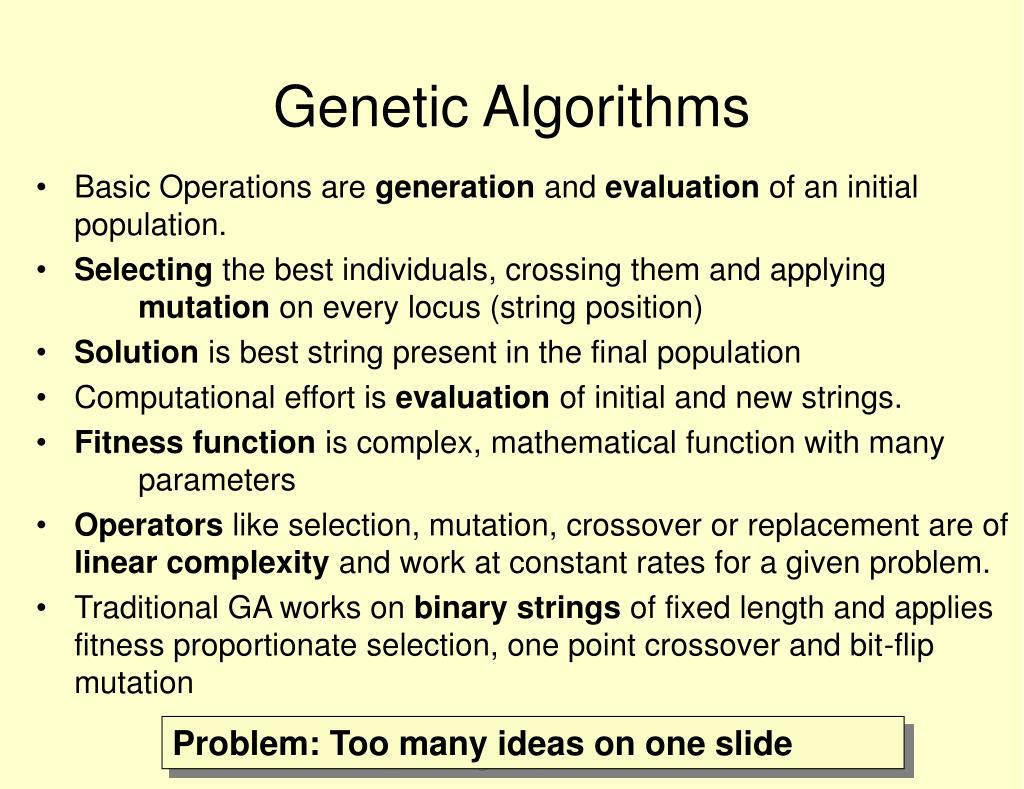 Genetic Algorithms • Basic Operations are generation and evaluation of an initial population. • Selecting the best individuals, crossing them and applying mutation on every locus (string position) • Solution is best string present in the final population • Computational effort is evaluation of initial and new strings. • Fitness function is complex, mathematical function with many parameters • Operators like selection, mutation, crossover or replacement are of linear complexity and work at constant rates for a given problem. • Traditional GA works on binary strings of fixed length and applies fitness proportionate selection, one point crossover and bit-flip mutation Problem: Too many ideas on one slide A Good Presentation by Jennifer Willies, EvoNet Summer School 2001