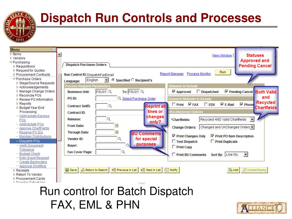 Session Overview This presentation will focus on the PO Dispatch step in Purchase Order Management. The five PO dispatch methods will be examined separately. Comparative strengths and weaknesses among the methods will be presented and potential pitfalls of each method will be highlighted. Ways to improve the fault tolerance of each method will be suggested, including procedural changes, configurations, and minor enhancements. Lastly, some precautions for vendor file management, testing and integrating with a third-party document repository will be covered.