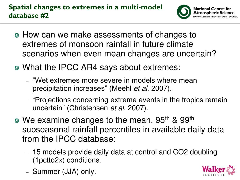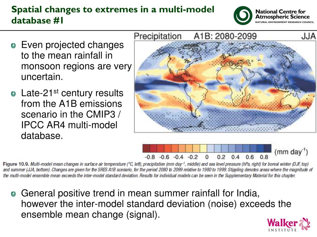 Spatial changes to extremes in a multi-model database #1 • Even projected changes to the mean rainfall in monsoon regions are very uncertain. • Late-21st century results from the A1B emissions scenario in the CMIP3 / IPCC AR4 multi-model database. General positive trend in mean summer rainfall for India, however the inter-model standard deviation (noise) exceeds the ensemble mean change (signal).