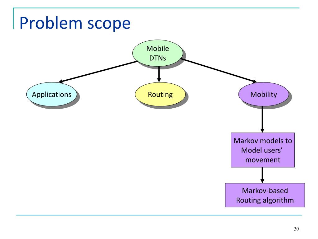 Problem scope Mobile DTNs Applications Routing Mobility Markov models to Model users’ movement Markov-based Routing algorithm