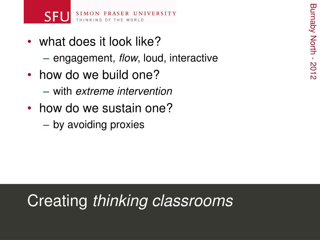 what does it look like? • engagement, flow, loud, interactive • how do we build one? • with extreme intervention • how do we sustain one? • by avoiding proxies Creating thinking classrooms