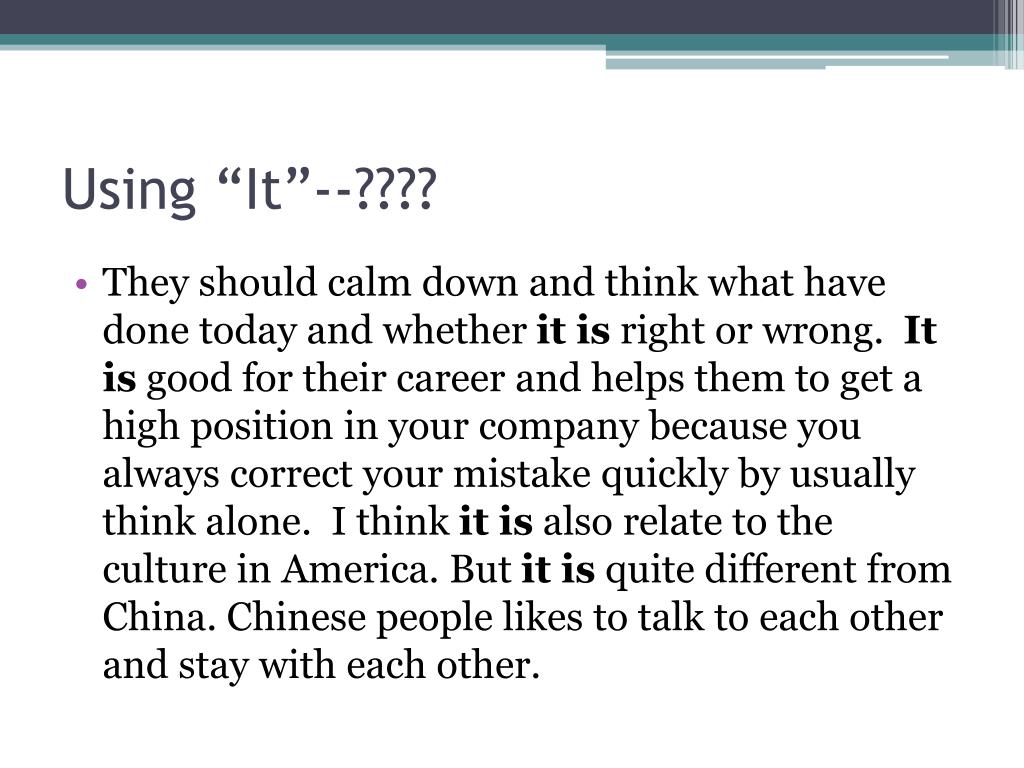 Using “It”--???? • They should calm down and think what have done today and whether it is right or wrong. It is good for their career and helps them to get a high position in your company because you always correct your mistake quickly by usually think alone. I think it is also relate to the culture in America. But it is quite different from China. Chinese people likes to talk to each other and stay with each other.