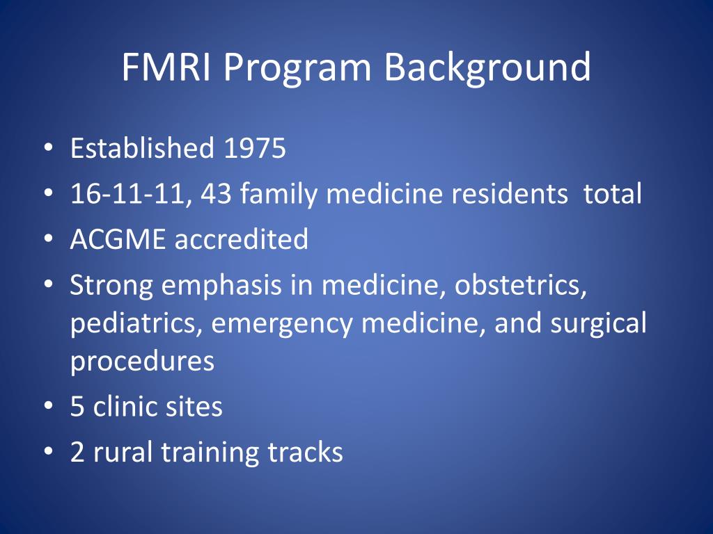 FMRI Program Background • Established 1975 • 16-11-11, 43 family medicine residents total • ACGME accredited • Strong emphasis in medicine, obstetrics, pediatrics, emergency medicine, and surgical procedures • 5 clinic sites • 2 rural training tracks