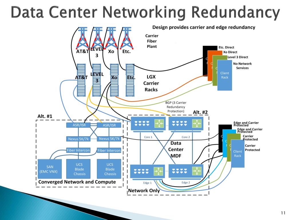 Network – Design Alternatives • Single vs. Multiple carriers • Single vs. Multiple entry points (Diverse Entry) • Single vs. Multiple carrier paths (Diverse Path) • Single vs. Dual lateral connection per carrier • Entry pathways owned vs. Carrier owned • Single vs. Dual core carrier routers to MDF • Single vs. Dual edge switches (HSRP) • Cisco 6500 series vs. Nexus with SDN • Carrier Battery plant vs. Operator A-B UPS