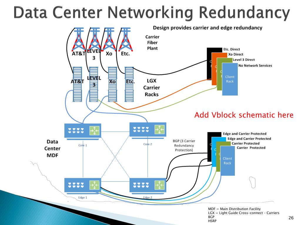 Data Center Networking Redundancy Add Vblock schematic here MDF = Main Distribution Facility LGX = Light Guide Cross-connect – Carriers BGP HSRP