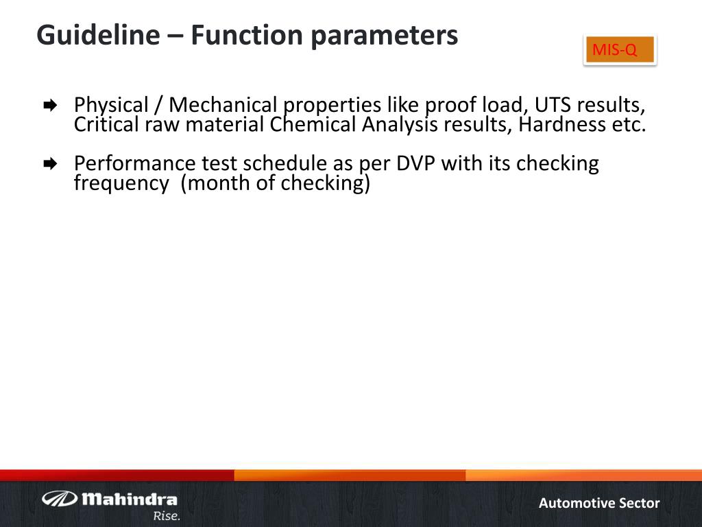 Guideline – Function parameters MIS-Q Physical / Mechanical properties like proof load, UTS results, Critical raw material Chemical Analysis results, Hardness etc. Performance test schedule as per DVP with its checking frequency (month of checking)