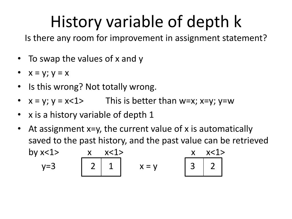 History variable of depth kIs there any room for improvement in assignment statement? • To swap the values of x and y • x = y; y = x • Is this wrong? Not totally wrong. • x = y; y = x<1> This is better than w=x; x=y; y=w • x is a history variable of depth 1 • At assignment x=y, the current value of x is automatically saved to the past history, and the past value can be retrieved by x<1> x x<1> x x<1> y=3 2 1 x = y 3 2