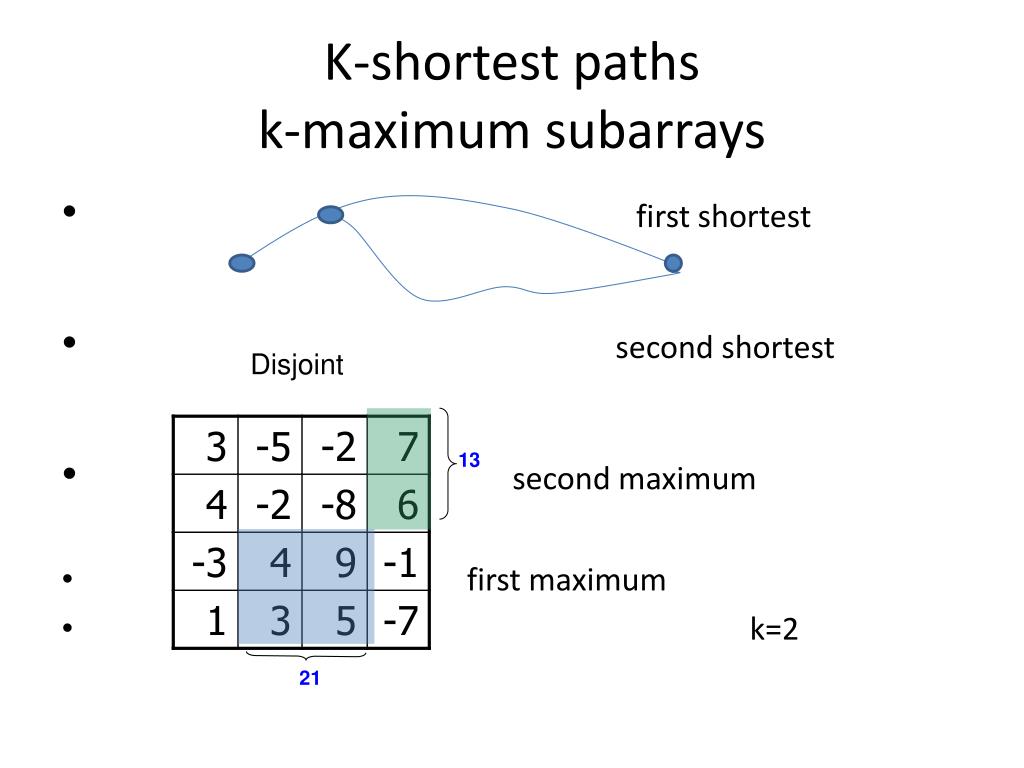 13 21 K-shortest pathsk-maximum subarrays • first shortest • second shortest • second maximum • first maximum • k=2 Disjoint