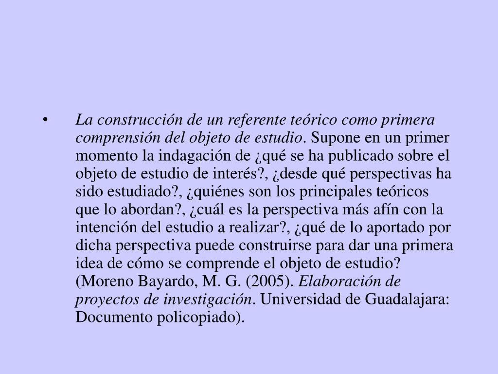 La construcción de un referente teórico como primera comprensión del objeto de estudio. Supone en un primer momento la indagación de ¿qué se ha publicado sobre el objeto de estudio de interés?, ¿desde qué perspectivas ha sido estudiado?, ¿quiénes son los principales teóricos que lo abordan?, ¿cuál es la perspectiva más afín con la intención del estudio a realizar?, ¿qué de lo aportado por dicha perspectiva puede construirse para dar una primera idea de cómo se comprende el objeto de estudio? (Moreno Bayardo, M. G. (2005). Elaboración de proyectos de investigación. Universidad de Guadalajara: Documento policopiado).