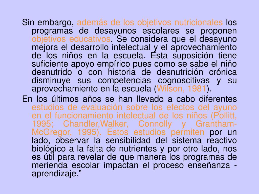 Sin embargo, además de los objetivos nutricionales los programas de desayunos escolares se proponen objetivos educativos. Se considera que el desayuno mejora el desarrollo intelectual y el aprovechamiento de los niños en la escuela. Esta suposición tiene suficiente apoyo empírico pues como se sabe el niño desnutrido o con historia de desnutrición crónica disminuye sus competencias cognoscitivas y su aprovechamiento en la escuela (Wilson, 1981). En los últimos años se han llevado a cabo diferentes estudios de evaluación sobre los efectos del ayuno en el funcionamiento intelectual de los niños (Pollitt, 1995; Chandler,Walker, Connolly y Grantham-McGregor, 1995).Estos estudios permiten por un lado, observar la sensibilidad del sistema reactivo biológico a la falta de nutrientes y por otro lado, nos es útil para revelar de que manera los programas de merienda escolar impactan el proceso enseñanza - aprendizaje.”