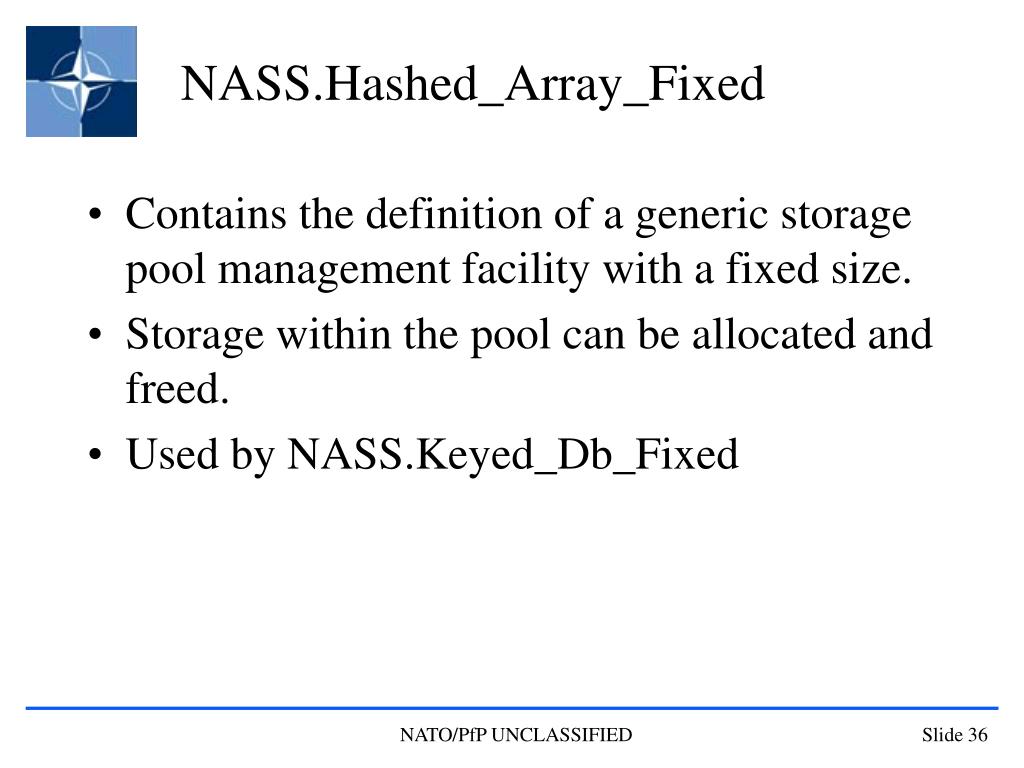 NASS.Hashed_Array_Fixed • Contains the definition of a generic storage pool management facility with a fixed size. • Storage within the pool can be allocated and freed. • Used by NASS.Keyed_Db_Fixed NATO/PfP UNCLASSIFIED