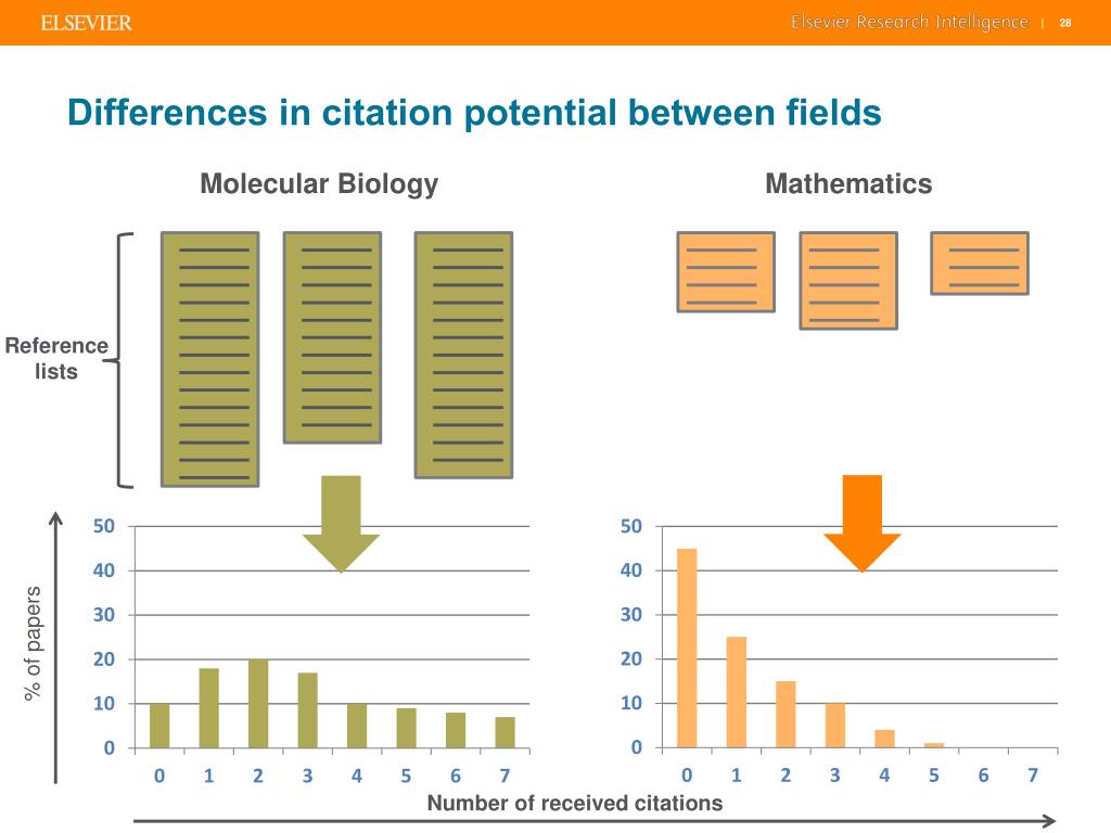Differences in citation potential between fields Molecular Biology Mathematics Reference lists % of papers Number of received citations