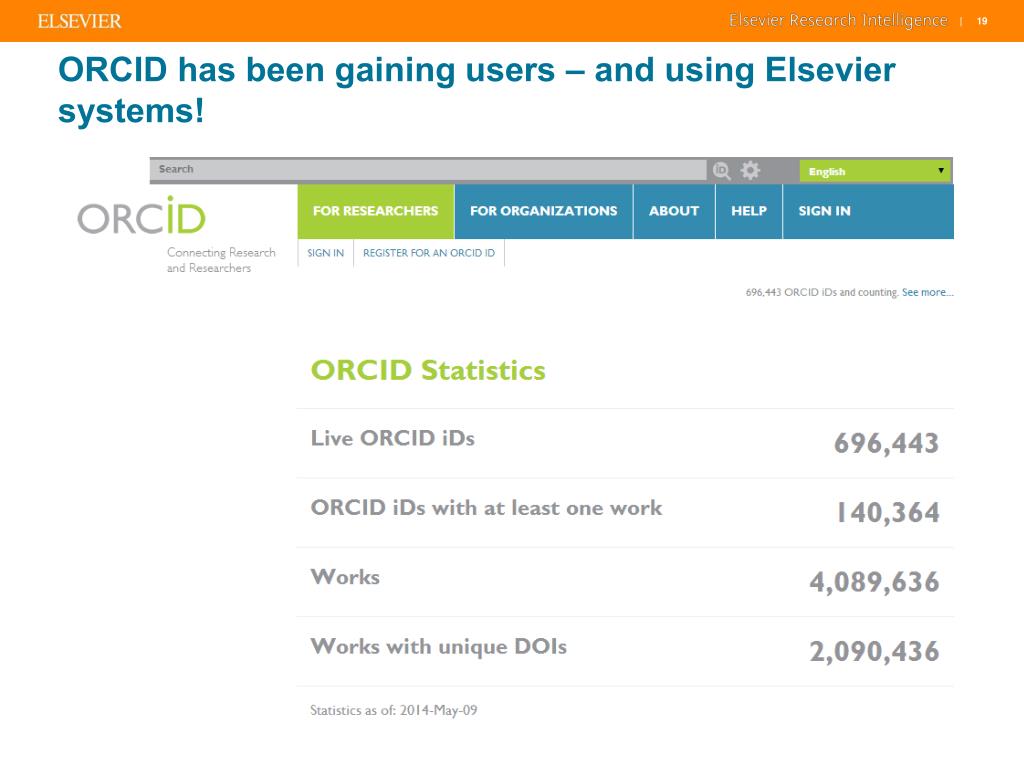 How is Elsevier involved with ORCID? • Elsevier is one of the industry sponsors of the ORCID initiative, and has representation on the Board • EES (EVISE), Elsevier Editorial System, has integrated with ORCID to capture (and assign) ORCIDs at the time of submission • Scopus allows users to import papers from Scopus to ORCID (or vice versa) and has other functionality related to ORCID • Add to ORCID is on Author Profile page • ORCID will appear on Author Profile page as of May 2014 release • Will be able to search on ORCID as of September 2014 release Three main goals: • Ensure interoperability between ORCID and Scopus Author ID • Ensure ORCID data enhances the quality of Scopus author profiles • Enable use of ORCIDs during Manuscript submission