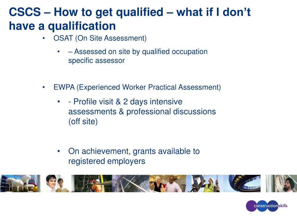 CSCS – How to get qualified – what if I don’t have a qualification • OSAT (On Site Assessment) • – Assessed on site by qualified occupation specific assessor • EWPA (Experienced Worker Practical Assessment) • - Profile visit & 2 days intensive assessments & professional discussions (off site) • On achievement, grants available to registered employers