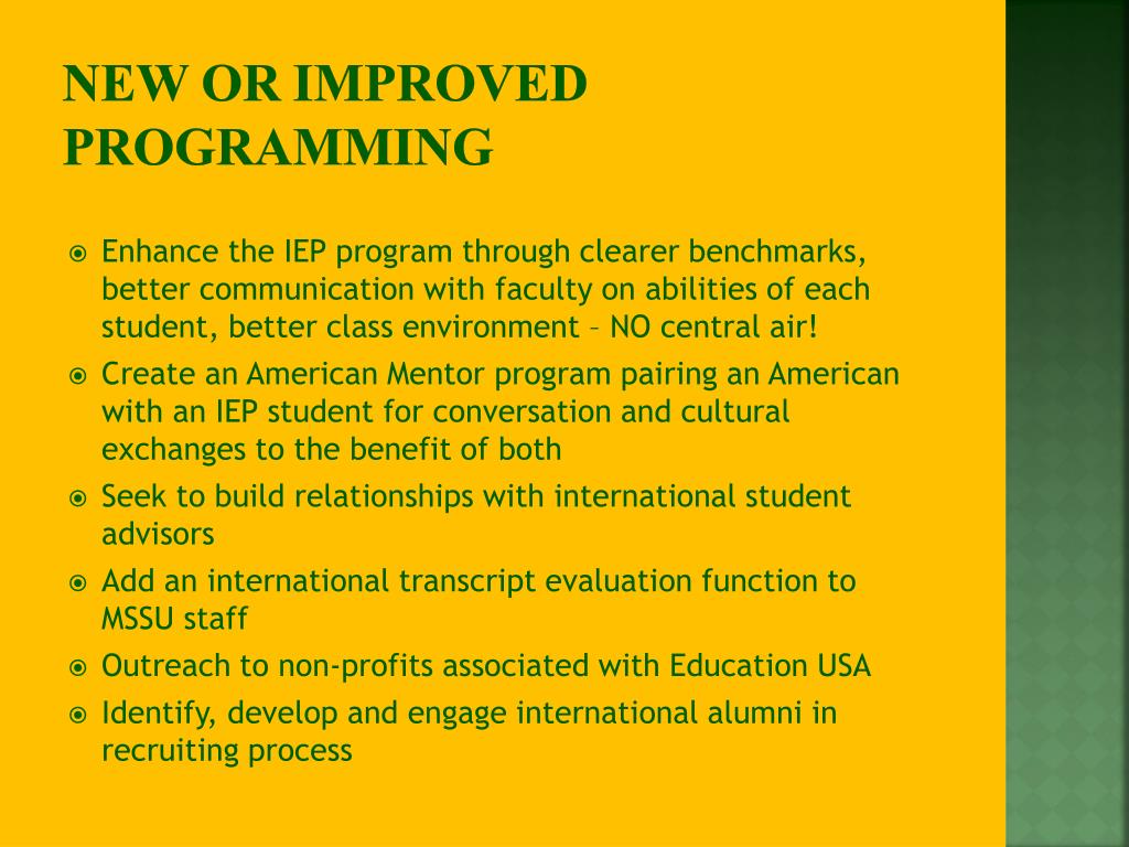 NEW or improved PROGRAMMING • Enhance the IEP program through clearer benchmarks, better communication with faculty on abilities of each student, better class environment – NO central air! • Create an American Mentor program pairing an American with an IEP student for conversation and cultural exchanges to the benefit of both • Seek to build relationships with international student advisors • Add an international transcript evaluation function to MSSU staff • Outreach to non-profits associated with Education USA • Identify, develop and engage international alumni in recruiting process