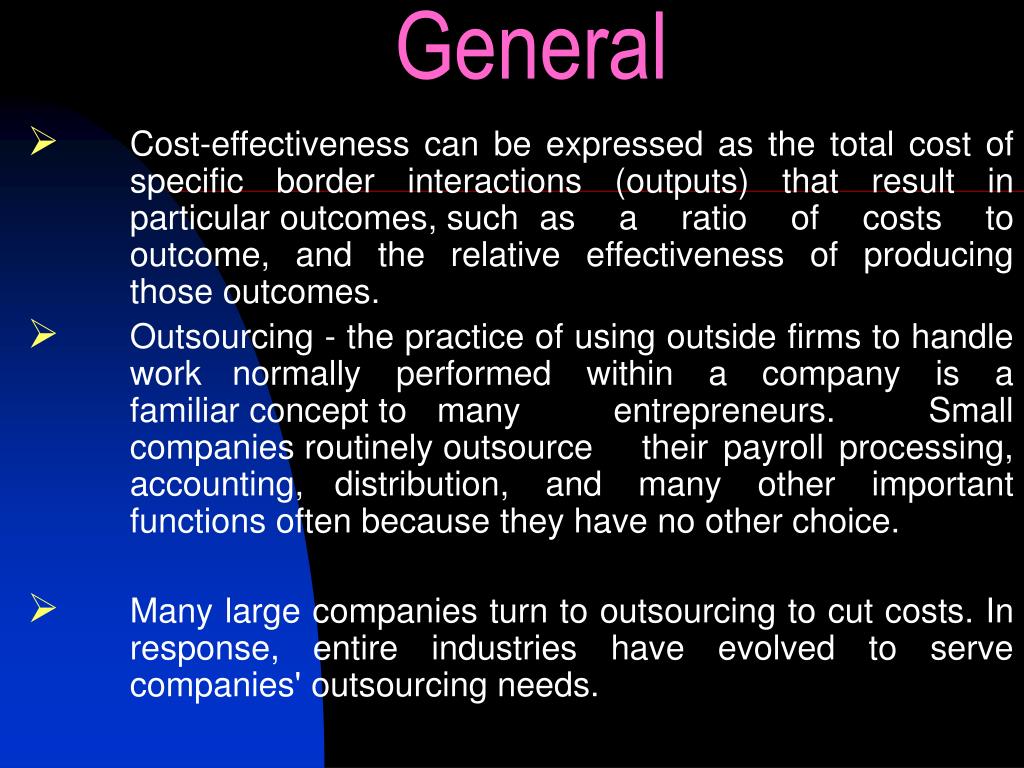 General Cost-effectiveness can be expressed as the total cost of specific border interactions (outputs) that result in particular outcomes, such as a ratio of costs to outcome, and the relative effectiveness of producing those outcomes. Outsourcing - the practice of using outside firms to handle work normally performed within a company is a familiar concept to many entrepreneurs. Small companies routinely outsource their payroll processing, accounting, distribution, and many other important functions often because they have no other choice. Many large companies turn to outsourcing to cut costs. In response, entire industries have evolved to serve companies' outsourcing needs.