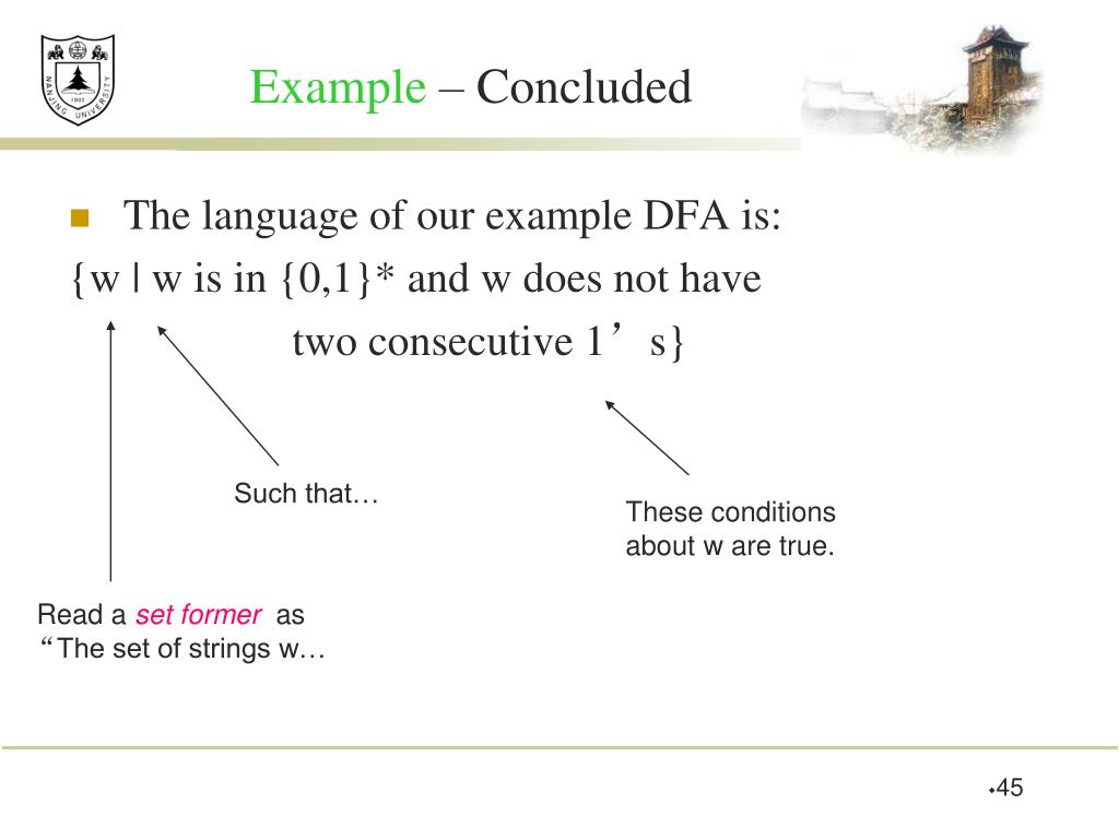 Such that… These conditions about w are true. Read a set former as “The set of strings w… Example – Concluded • The language of our example DFA is: {w | w is in {0,1}* and w does not have two consecutive 1’s}
