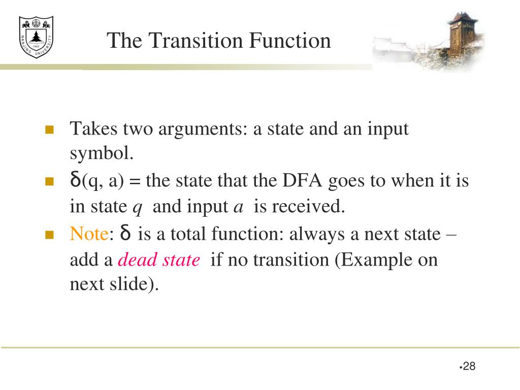 The Transition Function • Takes two arguments: a state and an input symbol. • δ(q, a) = the state that the DFA goes to when it is in state q and input a is received. • Note: δis a total function: always a next state – add a dead state if no transition (Example on next slide).