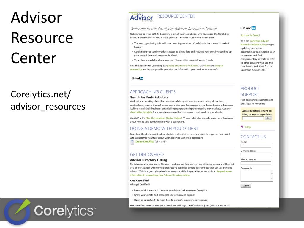 Agenda • Yesterday’s email to customers promoting advisors • Corelytics trial discontinuation, video test drive • Get a foot in the door with new Vital Signs Reports • Client set-ups just got easier... Corelytics.com/start • Contributions to upcoming book, "Pulse: Understanding the Vital Signs of your Business" • Testimonials and what customers say about dashboarding • Joint marketing campaigns with us • Guests stay for an introduction to the Corelytics Advisor Network (veterans can drop off the call.)