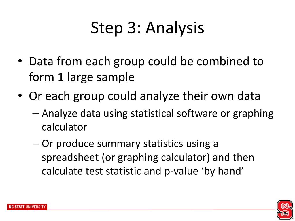 Step 3: Analysis • Data from each group could be combined to form 1 large sample • Or each group could analyze their own data • Analyze data using statistical software or graphing calculator • Or produce summary statistics using a spreadsheet (or graphing calculator) and then calculate test statistic and p-value ‘by hand’