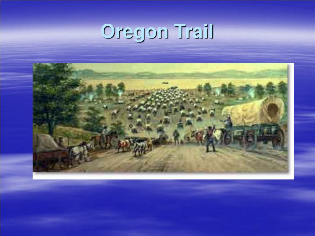 Wagons, ho! • Group of trails west from the Missouri River to the Columbia River area (all of which was known as Oregon) • “Jumping off” places where in Independence and Westport, MO • People traveled in wagons, usually pulled by oxen • People traveled on trail from 1859-1869 • About 2,000 miles long-took 4-6 months • Steam locomotive ended need for trails