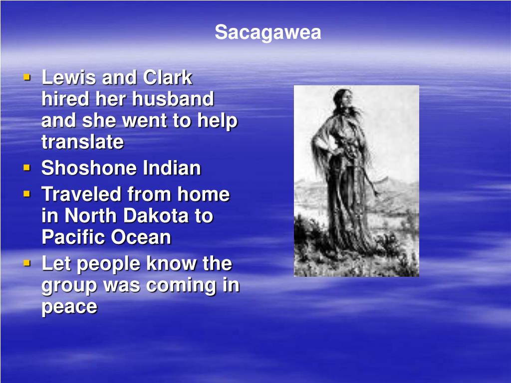 Sacagawea • Lewis and Clark hired her husband and she went to help translate • Shoshone Indian • Traveled from home in North Dakota to Pacific Ocean • Let people know the group was coming in peace