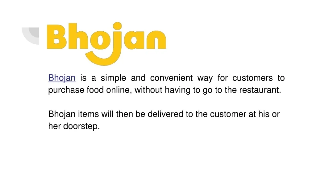 . Bhojan is a simple and convenient way for customers to purchase food online, without having to go to the restaurant. Bhojan items will then be delivered to the customer at his or her doorstep.