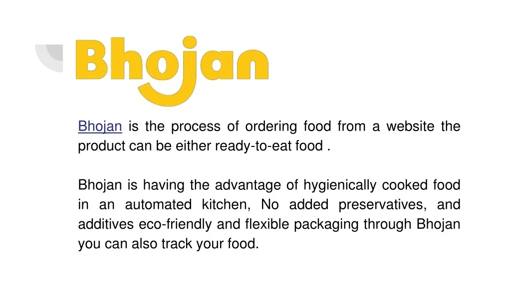 . Bhojan is the process of ordering food from a website the product can be either ready-to-eat food . Bhojan is having the advantage of hygienically cooked food in an automated kitchen, No added preservatives, and additives eco-friendly and flexible packaging through Bhojan you can also track your food.