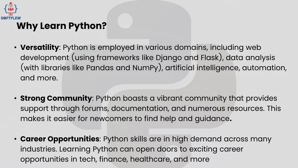 Why Learn Python? • Versatility: Python is employed in various domains, including web development (using frameworks like Django and Flask), data analysis (with libraries like Pandas and NumPy), artificial intelligence, automation, and more. • Strong Community: Python boasts a vibrant community that provides support through forums, documentation, and numerous resources. This makes it easier for newcomers to find help and guidance. • Career Opportunities: Python skills are in high demand across many industries. Learning Python can open doors to exciting career opportunities in tech, finance, healthcare, and more