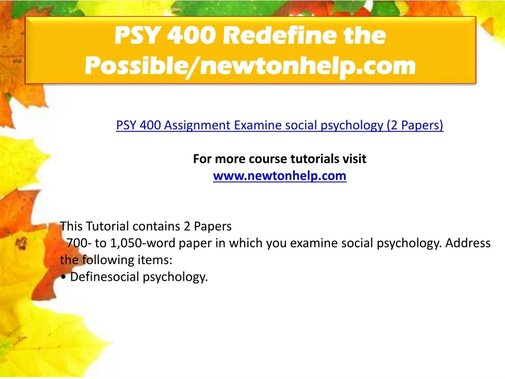 PSY 400 Redefine the Possible/newtonhelp.com PSY 400 Entire Course For more course tutorials visit www.newtonhelp.com PSY 400 Week 1 Discussion Question 1 PSY 400 Week 1 Discussion Question 2 PSY 400 Week 1 Individual Assignment Social Psychology Definition Paper