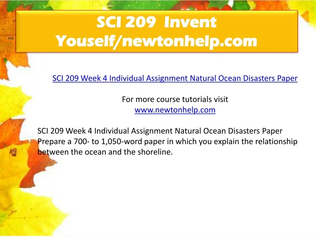 SCI 209 Invent Youself/newtonhelp.com SCI 209 Entire Course For more course tutorials visit www.newtonhelp.com SCI 209 Week 1 Individual Assignment NOAA Activity Part One Ocean Exploration SCI 209 Week 2 Individual Assignment The Creation Of The Ocean Floor Paper SCI 209 Week 3 Individual Assignment Seawater Paper