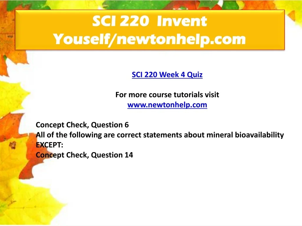 SCI 220 Invent Youself/newtonhelp.com SCI 220 Week 4 Quiz For more course tutorials visit www.newtonhelp.com Concept Check, Question 6 All of the following are correct statements about mineral bioavailability EXCEPT: Concept Check, Question 14