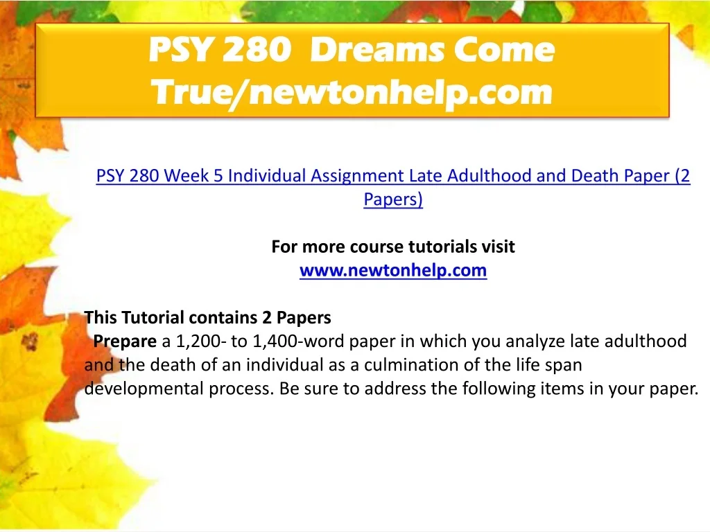 PSY 280 Dreams Come True/newtonhelp.com PSY 280 Week 5 Individual Assignment Late Adulthood and Death Paper (2 Papers) For more course tutorials visit www.newtonhelp.com This Tutorial contains 2 Papers Prepare a 1,200- to 1,400-word paper in which you analyze late adulthood and the death of an individual as a culmination of the life span developmental process. Be sure to address the following items in your paper.