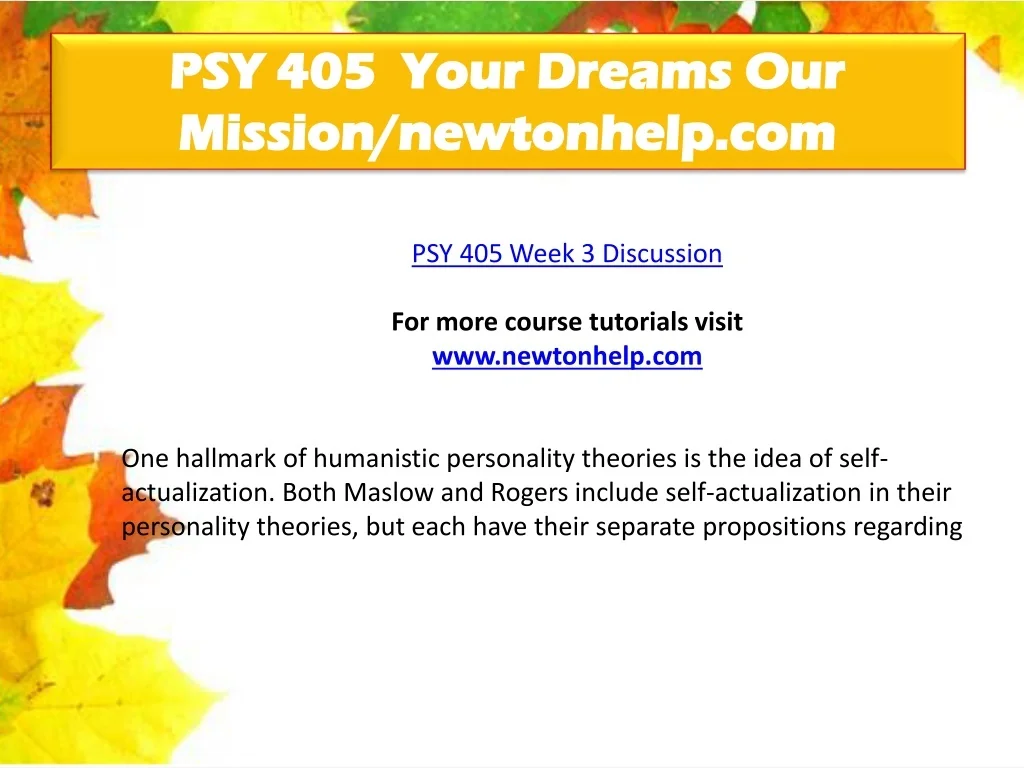 PSY 405 Your Dreams Our Mission/newtonhelp.com PSY 405 Week 3 Discussion For more course tutorials visit www.newtonhelp.com One hallmark of humanistic personality theories is the idea of self-actualization. Both Maslow and Rogers include self-actualization in their personality theories, but each have their separate propositions regarding