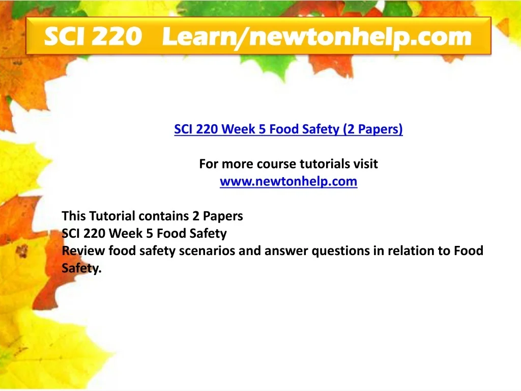 SCI 220 Learn/newtonhelp.com SCI 220 Week 5 Food Safety (2 Papers) For more course tutorials visit www.newtonhelp.com This Tutorial contains 2 Papers SCI 220 Week 5 Food Safety Review food safety scenarios and answer questions in relation to Food Safety.
