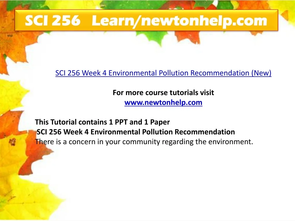 SCI 256 Learn/newtonhelp.com SCI 256 Week 4 Environmental Pollution Recommendation (New) For more course tutorials visit www.newtonhelp.com This Tutorial contains 1 PPT and 1 Paper SCI 256 Week 4 Environmental Pollution Recommendation There is a concern in your community regarding the environment.