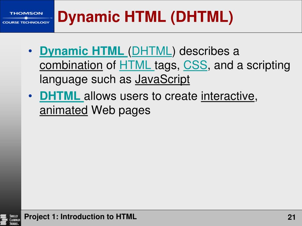 Dynamic HTML (DHTML) • Dynamic HTML(DHTML) describes a combination of HTML tags, CSS, and a scripting language such as JavaScript • DHTMLallows users to create interactive, animated Web pages Project 1: Introduction to HTML