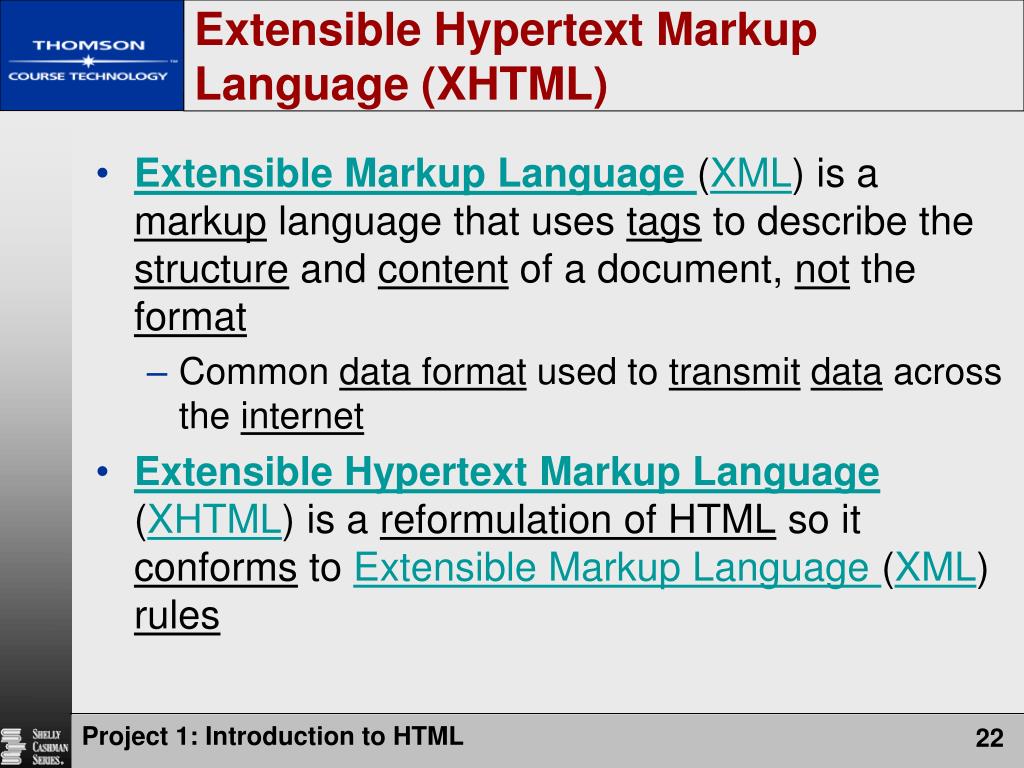 Extensible Hypertext Markup Language (XHTML) • Extensible Markup Language(XML) is a markup language that uses tags to describe the structure and content of a document, not the format • Common data format used to transmitdata across the internet • Extensible Hypertext Markup Language(XHTML) is a reformulation of HTML so it conforms to Extensible Markup Language (XML) rules Project 1: Introduction to HTML