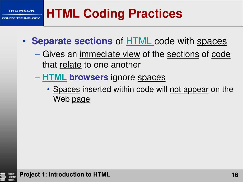 HTML Coding Practices • Separate sections of HTML code with spaces • Gives an immediate view of the sections of code that relate to one another • HTML browsers ignore spaces • Spaces inserted within code will not appear on the Web page Project 1: Introduction to HTML