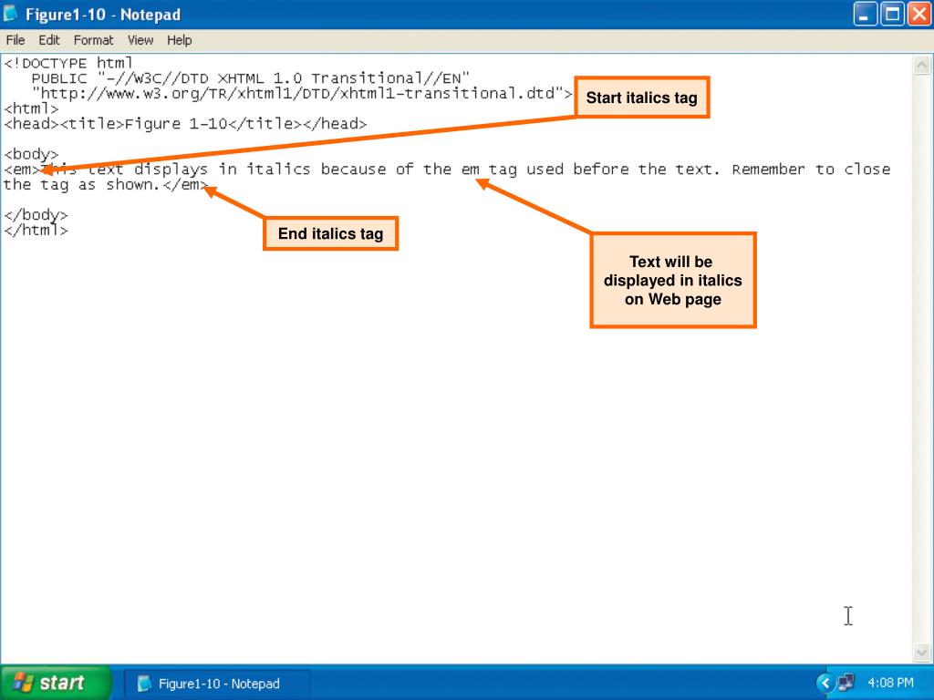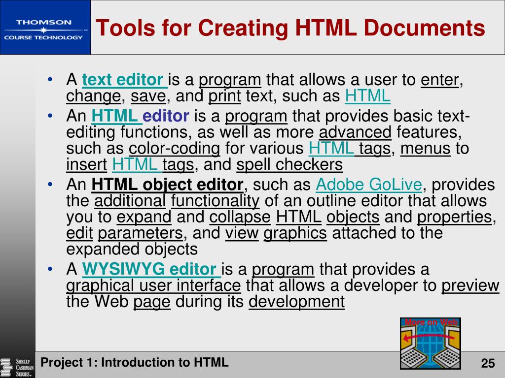 Tools for Creating HTML Documents Start italics tag End italics tag Text will be displayed in italicson Web page Project 1: Introduction to HTML