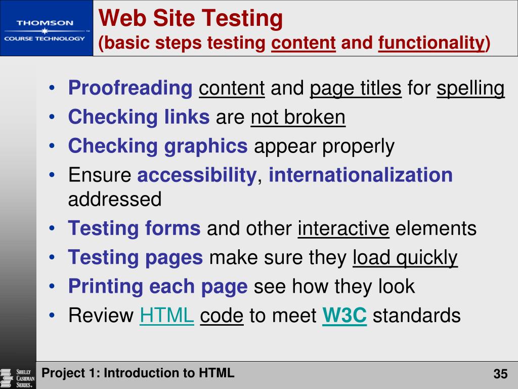 Web Site Testing(basic steps testing content and functionality) • Proofreadingcontent and page titles for spelling • Checking links are not broken • Checking graphics appear properly • Ensure accessibility, internationalization addressed • Testing forms and other interactive elements • Testing pages make sure they load quickly • Printing each page see how they look • Review HTMLcode to meet W3C standards Project 1: Introduction to HTML