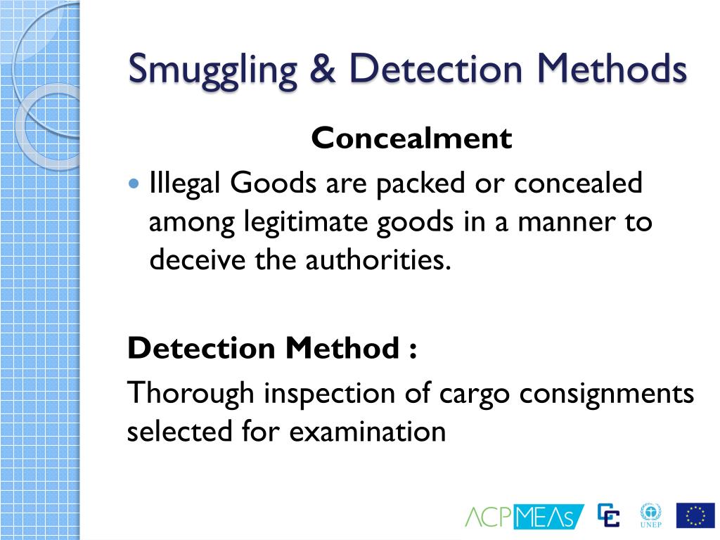 Smuggling Methods The combined effect of increased regulation and effective enforcement creates an incentive for persons to engage in illegal trade of environmentally sensitive goods. Smuggling methods are employed in an effort to “beat the system.” It is essential that Customs Officers must be aware that smugglers of all kind attempt to utilize the same channels and methods